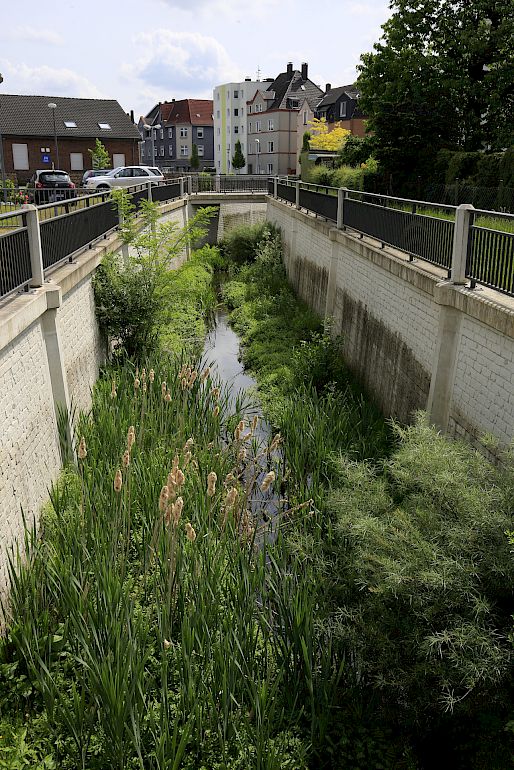 Since the 1920s, the course of the Deininghauser stream had been converted to an open wastewater canal due to the mining activities, straightened and routed to the main course of the Emscher as a central wastewater canal for the Ruhr area. The wastewater and surface water were not separated in the Emscher system, with open courses of untreated wastewater totalling roughly 350 km in length. IBAIBA Internationale Bauausstellung Emscher Park selected the stream as a pilot project for the ecological renewal of Emscher feeder rivers.