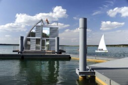 Since IBA see started its work to change the landscape and structure of the Lusatia region in 2000, it promoted its vision of floating architecture and did pioneering work in this field. The first specific designs were presented in 2003. IBA see presented two models to the public, one timber structure and one metal structure, and just one year later first investors expressed their interest. However, the start of construction for the steel design had to be postponed again and again – despite great interest and design awards: A floating home presented the authorities, investors, building companies and IBA see with unforeseen challenges.
