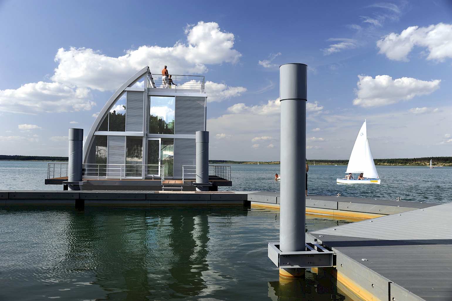 A feasible solution was finally found in the region: A metal work company from Finsterwalde initially built two prototypes on land, rented them to vacationers and then decided to invest in floating homes on Lake Geierswalde. He opened the first floating house called “ar-che” in 2009. Four more followed. Together with other beach houses, this small floating settlement called Lausitz Resort is the setting for the holiday port and holiday village of Scado.