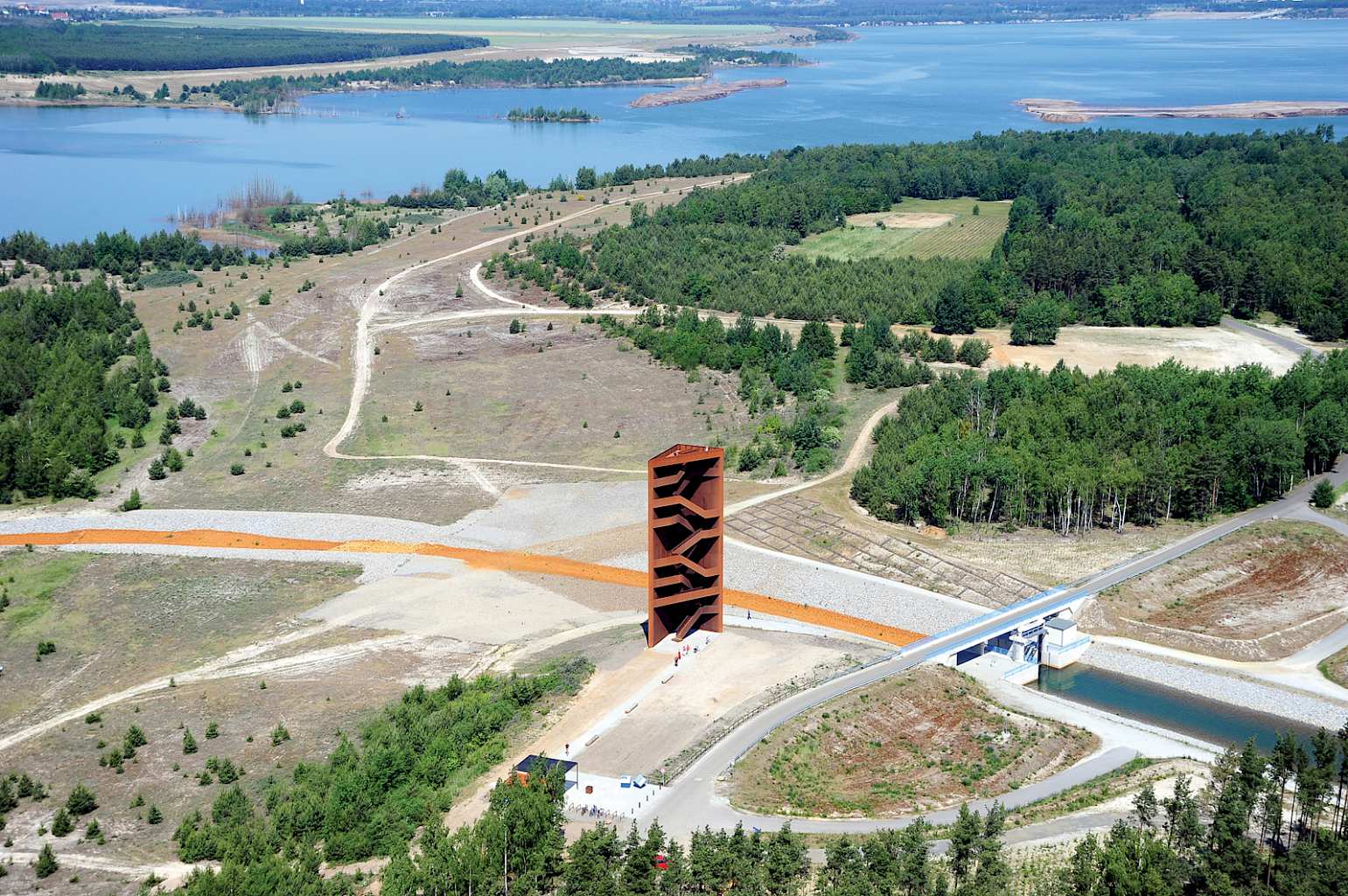 According to IBA’s vision, the lakes should be seen for what they are – man-made. It is these very breaks and links between industry and nature that shape the Lusatian Lakeland and the region. At a connecting canal, IBA see staged this tension in the centre of the lake landscape with a landmark, an accessible sculpture. The result of an architectural competition, the rust-coloured corten steel viewing tower is a reminder of the industrial history of the region and its mining machinery. At the same time, as a modern sculpture, it also emphasises what is new, unique and unusual about this changing landscape. From a height of 30 metres, visitors can now see three lakes at once as well as the Schwarze Pumpe, Boxberg and Jänschwalde power stations on the horizon.